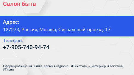 Салон быта по адресу 127273, Россия, Москва, Сигнальный проезд, 17 в дальнейшем Организация, размещена в следующих категориях: