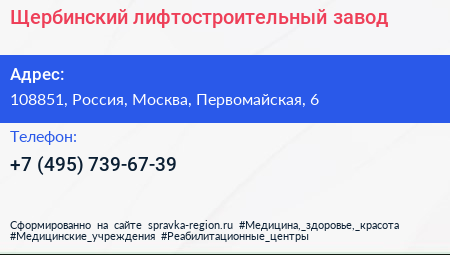 Щербинский лифтостроительный завод по адресу 108851, Россия, Москва, Первомайская, 6 в дальнейшем Организация, размещена в следующих категориях: