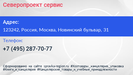 Северопроект-сервис по адресу 123242, Россия, Москва, Новинский бульвар, 31 в дальнейшем Организация, размещена в следующих категориях: