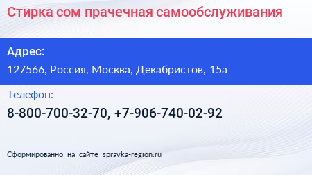 Стирка.сом, прачечная самообслуживания по адресу 127566, Россия, Москва, Декабристов, 15а в дальнейшем Организация, размещена в следующих категориях: