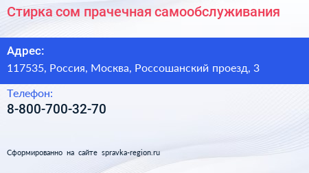Стирка.сом, прачечная самообслуживания по адресу 117535, Россия, Москва, Россошанский проезд, 3 в дальнейшем Организация, размещена в следующих категориях: