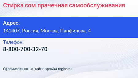 Стирка.сом, прачечная самообслуживания по адресу 141407, Россия, Москва, Панфилова, 4 в дальнейшем Организация, размещена в следующих категориях: