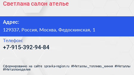 Светлана, салон-ателье по адресу 129337, Россия, Москва, Федоскинская, 1 в дальнейшем Организация, размещена в следующих категориях:
