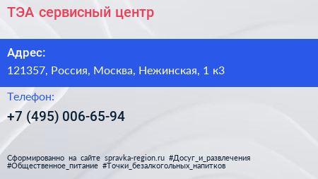 ТЭА, сервисный центр по адресу 121357, Россия, Москва, Нежинская, 1 к3 в дальнейшем Организация, размещена в следующих категориях: