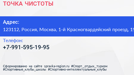 ТОЧКА ЧИСТОТЫ по адресу 123112, Россия, Москва, 1-й Красногвардейский проезд, 19 в дальнейшем Организация, размещена в следующих категориях: