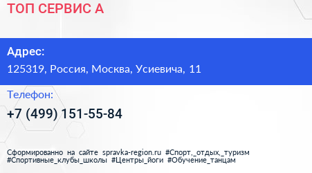ТОП-СЕРВИС А по адресу 125319, Россия, Москва, Усиевича, 11 в дальнейшем Организация, размещена в следующих категориях: