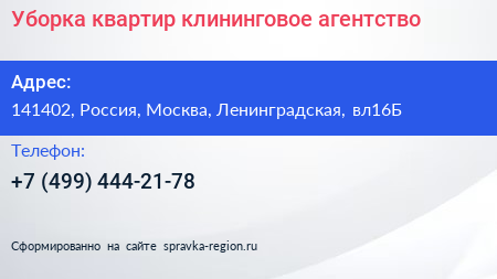Уборка квартир, клининговое агентство по адресу 141402, Россия, Москва, Ленинградская, вл16Б в дальнейшем Организация, размещена в следующих категориях: