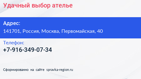Удачный выбор, ателье по адресу 141701, Россия, Москва, Первомайская, 40 в дальнейшем Организация, размещена в следующих категориях: