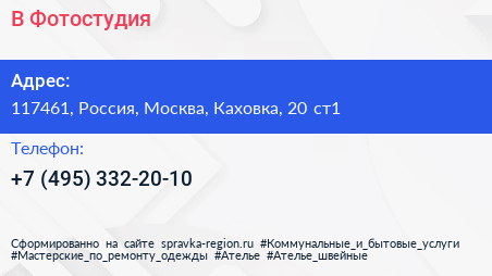 В-Фотостудия по адресу 117461, Россия, Москва, Каховка, 20 ст1 в дальнейшем Организация, размещена в следующих категориях: