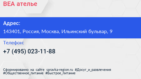 ВЕА, ателье по адресу 143401, Россия, Москва, Ильинский бульвар, 9 в дальнейшем Организация, размещена в следующих категориях: