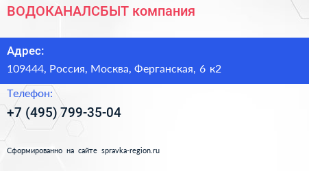 ВОДОКАНАЛСБЫТ, компания по адресу 109444, Россия, Москва, Ферганская, 6 к2 в дальнейшем Организация, размещена в следующих категориях: