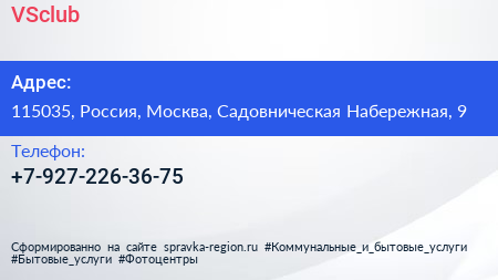 VSclub по адресу 115035, Россия, Москва, Садовническая Набережная, 9 в дальнейшем Организация, размещена в следующих категориях: