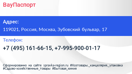 ВауПаспорт по адресу 119021, Россия, Москва, Зубовский бульвар, 17 в дальнейшем Организация, размещена в следующих категориях: