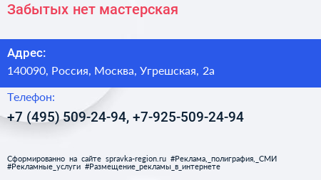 Забытых нет, мастерская по адресу 140090, Россия, Москва, Угрешская, 2а в дальнейшем Организация, размещена в следующих категориях: