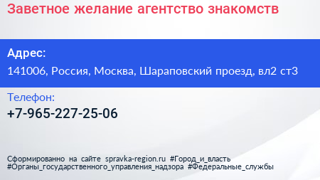Заветное желание, агентство знакомств по адресу 141006, Россия, Москва, Шараповский проезд, вл2 ст3 в дальнейшем Организация, размещена в следующих категориях: