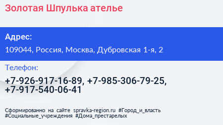 Золотая Шпулька, ателье по адресу 109044, Россия, Москва, Дубровская 1-я, 2 в дальнейшем Организация, размещена в следующих категориях: