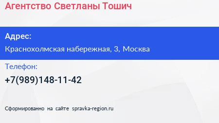 Агентство Светланы Тошич по адресу Краснохолмская набережная, 3, Москва в дальнейшем Организация, размещена в следующих категориях: