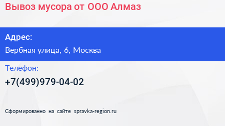 Вывоз мусора от ООО «Алмаз» по адресу Вербная улица, 6, Москва в дальнейшем Организация, размещена в следующих категориях: