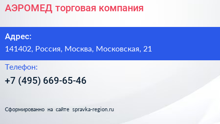 АЭРОМЕД, торговая компания по адресу 141402, Россия, Москва, Московская, 21 в дальнейшем Организация, размещена в следующих категориях: