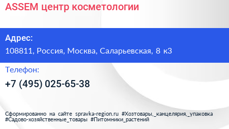 ASSEM, центр косметологии по адресу 108811, Россия, Москва, Саларьевская, 8 к3 в дальнейшем Организация, размещена в следующих категориях: