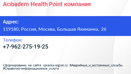 Acıbadem Health Point, компания по адресу 119180, Россия, Москва, Большая Якиманка, 26 в дальнейшем Организация, размещена в следующих категориях: