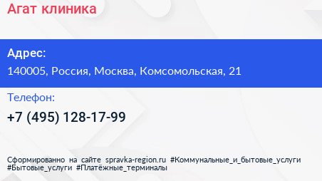 Агат, клиника по адресу 140005, Россия, Москва, Комсомольская, 21 в дальнейшем Организация, размещена в следующих категориях: