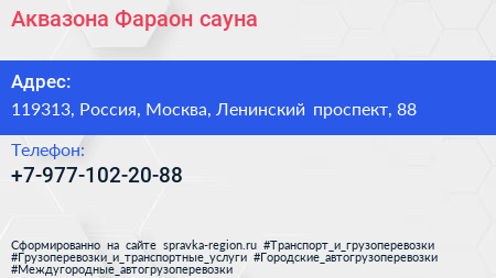 Аквазона Фараон, сауна по адресу 119313, Россия, Москва, Ленинский проспект, 88 в дальнейшем Организация, размещена в следующих категориях: