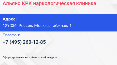 Альянс КРК, наркологическая клиника по адресу 129336, Россия, Москва, Таёжная, 1 в дальнейшем Организация, размещена в следующих категориях: