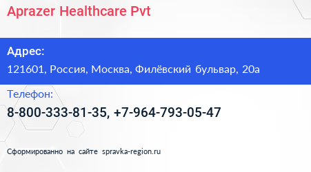 Aprazer Healthcare Pvt по адресу 121601, Россия, Москва, Филёвский бульвар, 20а в дальнейшем Организация, размещена в следующих категориях: