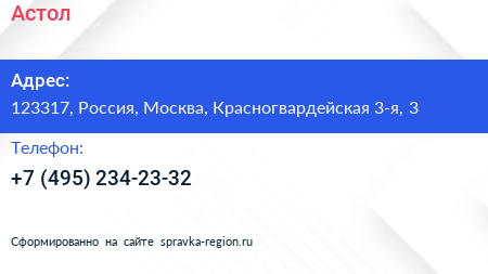 Астол по адресу 123317, Россия, Москва, Красногвардейская 3-я, 3 в дальнейшем Организация, размещена в следующих категориях: