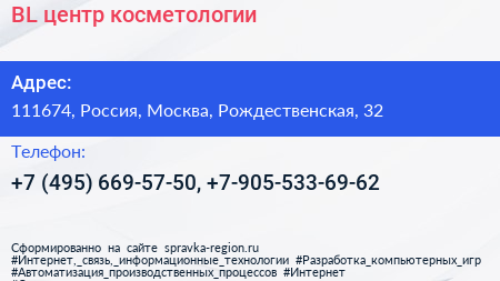 BL, центр косметологии по адресу 111674, Россия, Москва, Рождественская, 32 в дальнейшем Организация, размещена в следующих категориях: