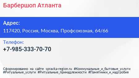 Барбершоп Атланта по адресу 117420, Россия, Москва, Профсоюзная, 64/66 в дальнейшем Организация, размещена в следующих категориях: