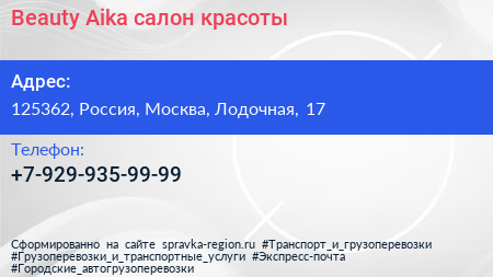 Beauty Aika, салон красоты по адресу 125362, Россия, Москва, Лодочная, 17 в дальнейшем Организация, размещена в следующих категориях: