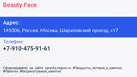 Beauty Face по адресу 141006, Россия, Москва, Шараповский проезд, ст7 в дальнейшем Организация, размещена в следующих категориях:
