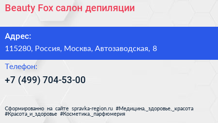Beauty Fox, салон депиляции по адресу 115280, Россия, Москва, Автозаводская, 8 в дальнейшем Организация, размещена в следующих категориях: