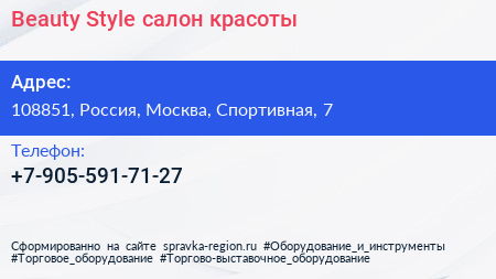 Beauty Style, салон красоты по адресу 108851, Россия, Москва, Спортивная, 7 в дальнейшем Организация, размещена в следующих категориях: