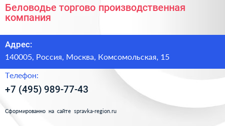 Беловодье, торгово-производственная компания по адресу 140005, Россия, Москва, Комсомольская, 15 в дальнейшем Организация, размещена в следующих категориях: