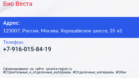 Био Веста по адресу 123007, Россия, Москва, Хорошёвское шоссе, 35 к1 в дальнейшем Организация, размещена в следующих категориях: