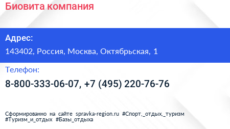 Биовита, компания по адресу 143402, Россия, Москва, Октябрьская, 1 в дальнейшем Организация, размещена в следующих категориях: