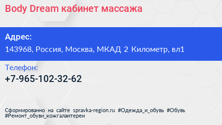 Body Dream, кабинет массажа по адресу 143968, Россия, Москва, МКАД 2 Километр, вл1 в дальнейшем Организация, размещена в следующих категориях: