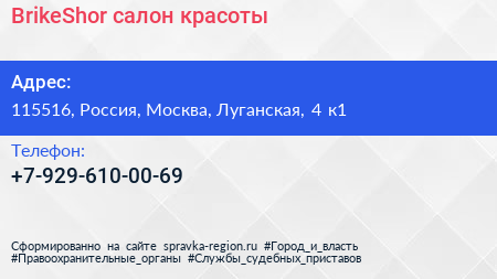 BrikeShor, салон красоты по адресу 115516, Россия, Москва, Луганская, 4 к1 в дальнейшем Организация, размещена в следующих категориях: