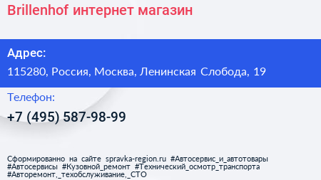 Brillenhof, интернет-магазин по адресу 115280, Россия, Москва, Ленинская Слобода, 19 в дальнейшем Организация, размещена в следующих категориях: