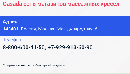Casada, сеть магазинов массажных кресел по адресу 143401, Россия, Москва, Международная, 6 в дальнейшем Организация, размещена в следующих категориях: