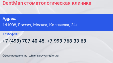 DentMan, стоматологическая клиника по адресу 141008, Россия, Москва, Колпакова, 24а в дальнейшем Организация, размещена в следующих категориях: