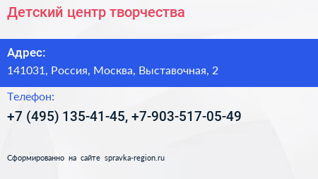 Детский центр творчества по адресу 141031, Россия, Москва, Выставочная, 2 в дальнейшем Организация, размещена в следующих категориях:
