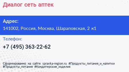 Диалог, сеть аптек по адресу 141002, Россия, Москва, Шараповская, 2 к1 в дальнейшем Организация, размещена в следующих категориях: