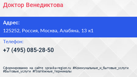 Доктор Венедиктова по адресу 125252, Россия, Москва, Алабяна, 13 к1 в дальнейшем Организация, размещена в следующих категориях: