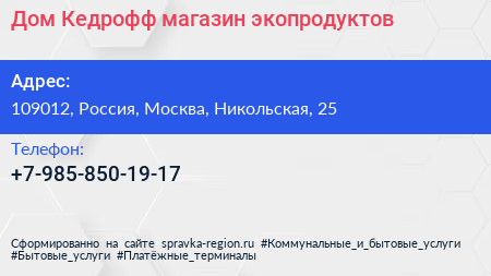 Дом Кедрофф, магазин экопродуктов по адресу 109012, Россия, Москва, Никольская, 25 в дальнейшем Организация, размещена в следующих категориях: