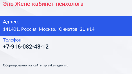 Эль Жене, кабинет психолога по адресу 141401, Россия, Москва, Юннатов, 21 к14 в дальнейшем Организация, размещена в следующих категориях: