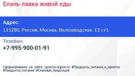 Елань, лавка живой еды по адресу 115280, Россия, Москва, Велозаводская, 13 ст1 в дальнейшем Организация, размещена в следующих категориях: